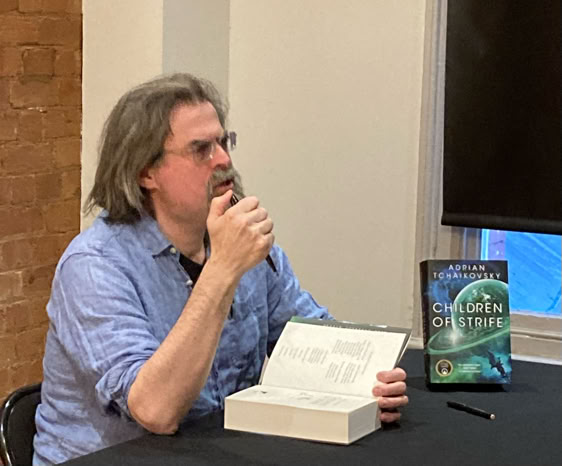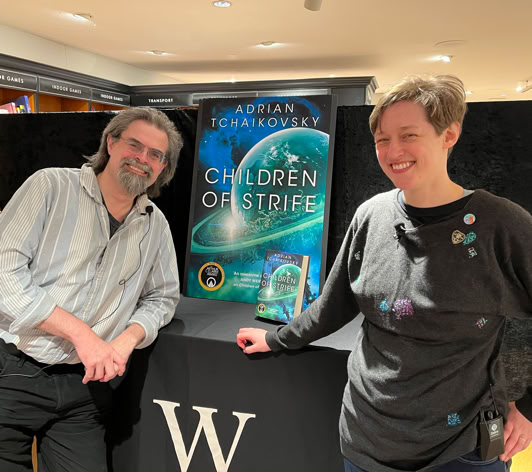 There was a fantastic turnout for Adrian's evening at Waterstones in Tottenham Court Road, London where Adrian gave a reading from Children of Strife, was interviewed by Felix Mosse and took audience questions. There were also opportunities for signing and it was a joy to see books from all over the world as well as a full set in Hungarian! Thank you to everyone who came.